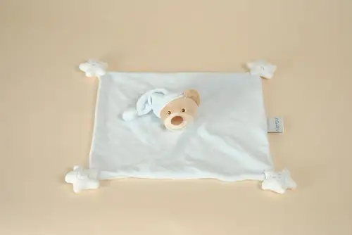 Doudou Ours plat bleu et blanc, sa petite tête marron et son museau blanc. Ses yeux et sont nez brodés au fil noir. Brodé “Droit au but” et « Allez L’OM! ». Pour les supporters de football de Marseille, enfin surtout pour les supporters en culotte courte!