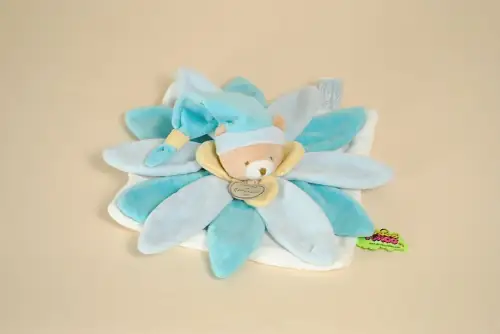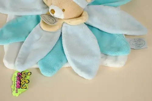 Ce doudou ours plat pétale bleu Tatoo de la collection « Collector » de Doudou et Compagnie séduit par sa douceur et son design raffiné avec col jaune. Facile à manipuler par les petites mains, il accompagne bébé dès les premiers jours pour l’apaiser et le sécuriser. Un compagnon tout en tendresse, parfait pour les moments câlins ou le coucher.