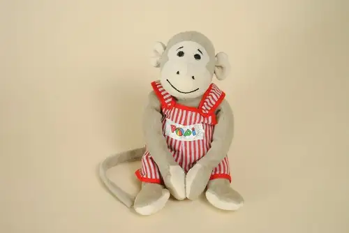 Peluche Singe Popi avec sa salopette rayée rouge et blanc Occasion en Excellent Etat et Très Bon Etat